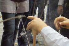 Eine Glocke ruft zum Mittagessen. Nach und nach finden sich die kleinen Handwerker, Wachen und Mönche an den rustikalen Holztischen ein. Die Suppe oder der Brei wird mit Holzlöffeln gegessen. Eben richtig wie im Mittelalter. Es hat allen viel Spaß gemacht.